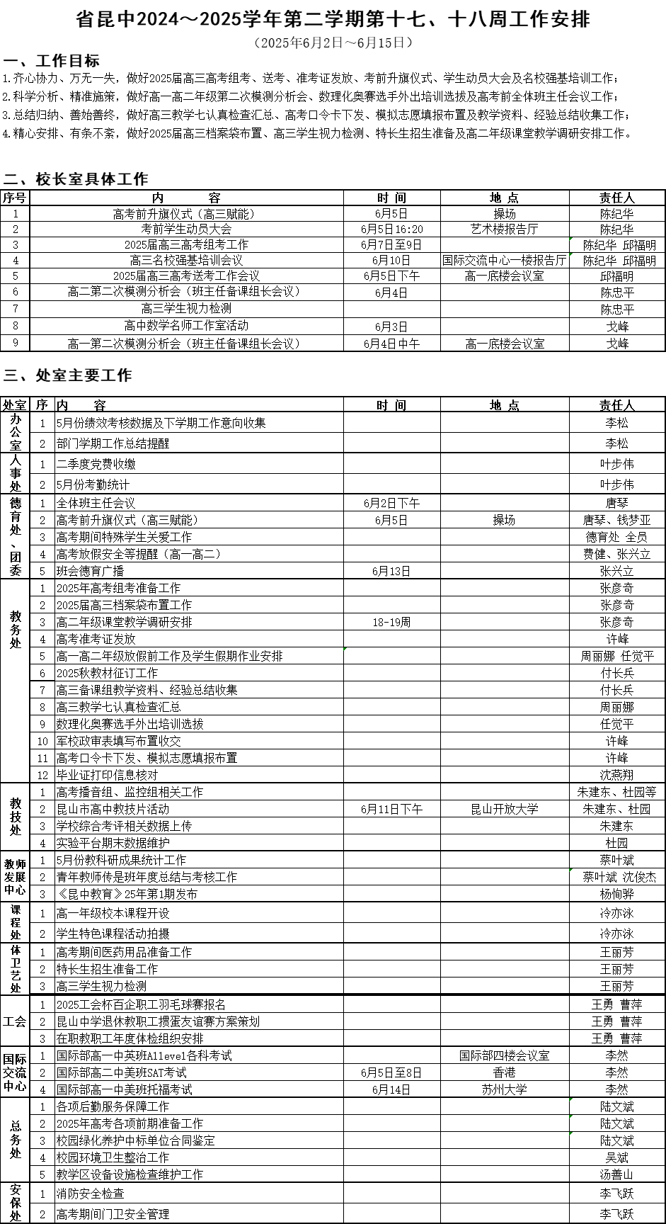 江苏省昆山中学2024-2025学年第二学期第十七、十八周工作安排