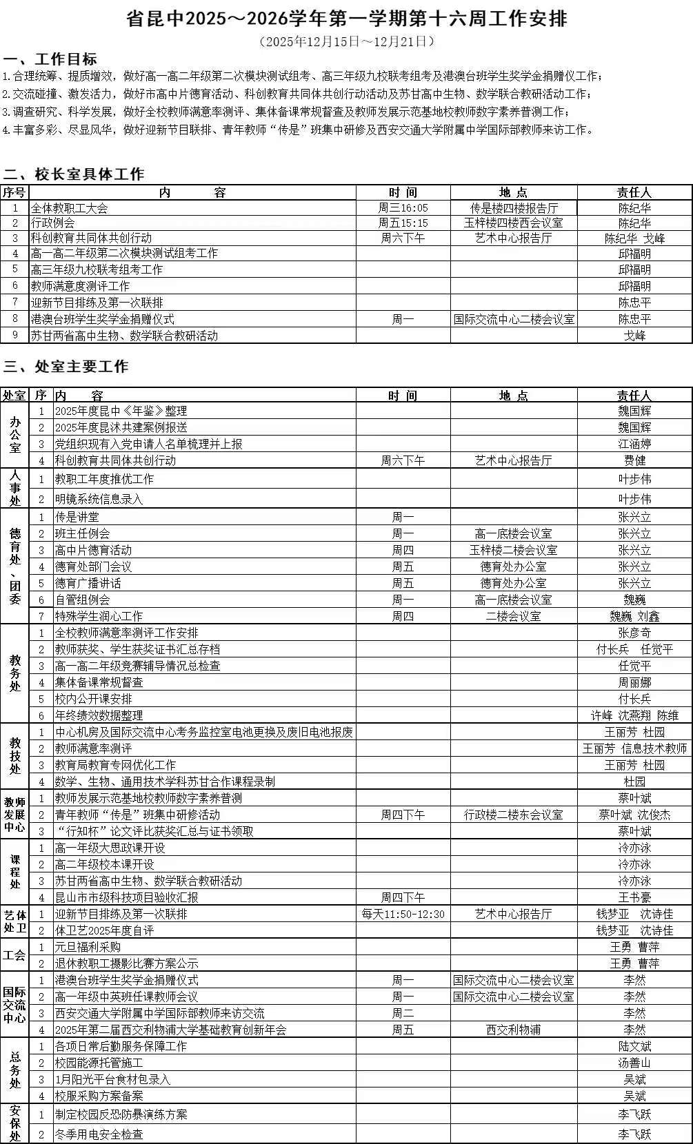 江苏省昆山中学2025-2026学年第一学期第十六周工作安排